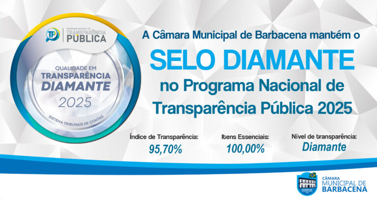 A Câmara Municipal de Barbacena conquistou novamente o Selo Diamante em Transparência Pública, a mais alta certificação concedida pelo Programa Nacional de Transparência Pública (PNTP), em parceria com a Atricon (Associação dos Membros dos Tribunais de Contas do Brasil) e os Tribunais de Contas de todo o país. A premiação reconhece órgãos públicos que se destacam pelo elevado cumprimento das normas de transparência e acesso à informação.
